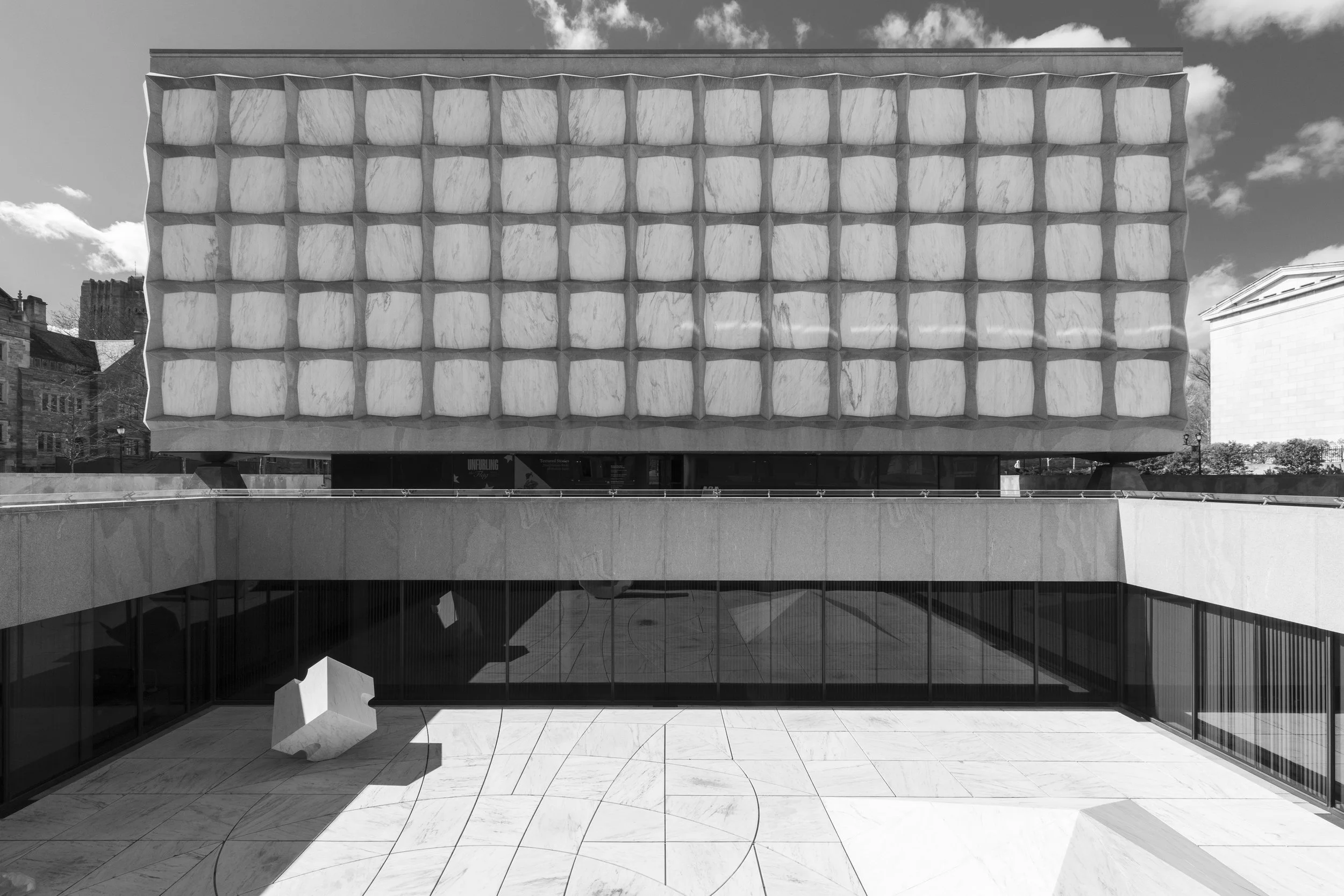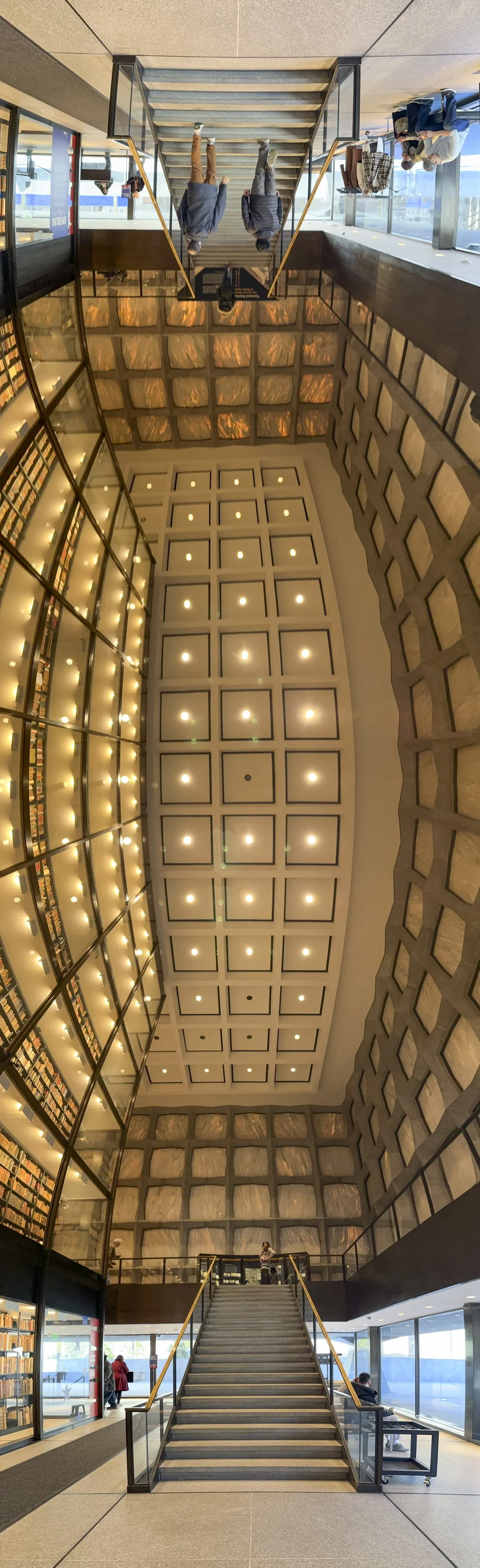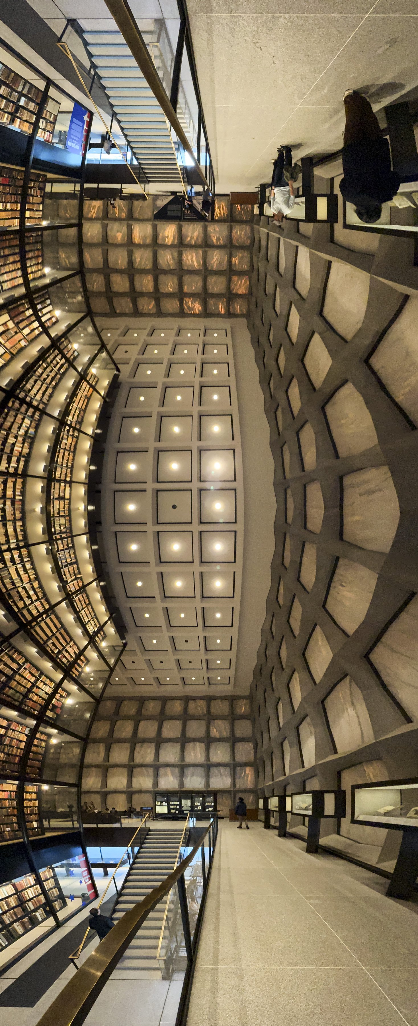 This library in particular has very interesting architecture. Designed by Gordon Bunshaft of Skidmore, Owings, and Merrill (SOM) and built in 1963, the building is basically a marble cube containing a glass cube. Marble squares that make up the outside are cut so thin that they let some daylight through, but not enough to damage the books. Inside there is a huge open space so you can see the entire facade from the inside.
